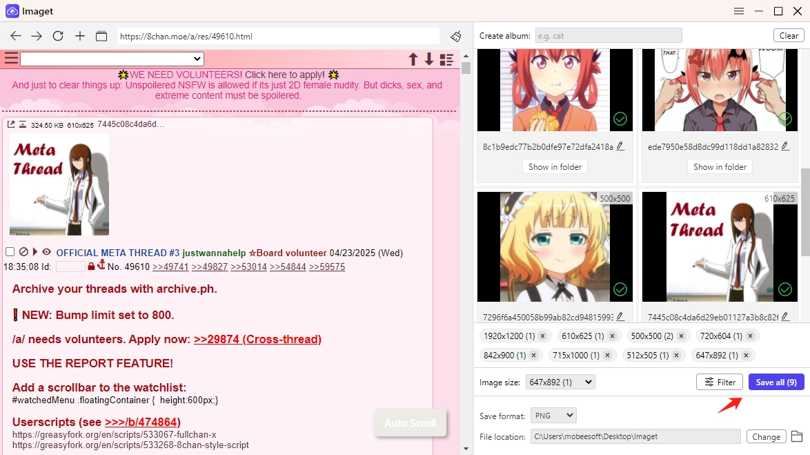 Step 2: Open Imaget, navigate to 8chan.moe and locate the page that contains iamges you want to download, then click the Auto Scroll button to make Imaget detecting and displaying images within the interface.